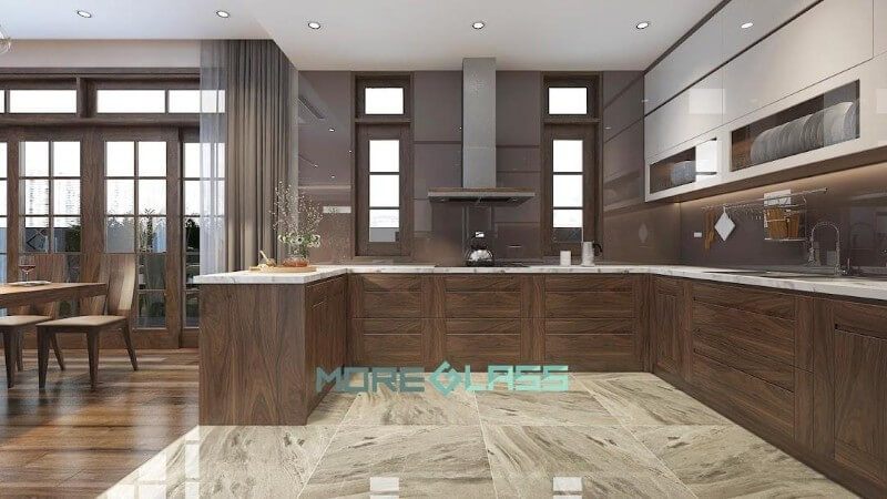 Mẫu kính ốp bếp màu nâu đất MG-017 đơn giản tạo cảm giác ấm cúng, gần gũi cho gian bếp.