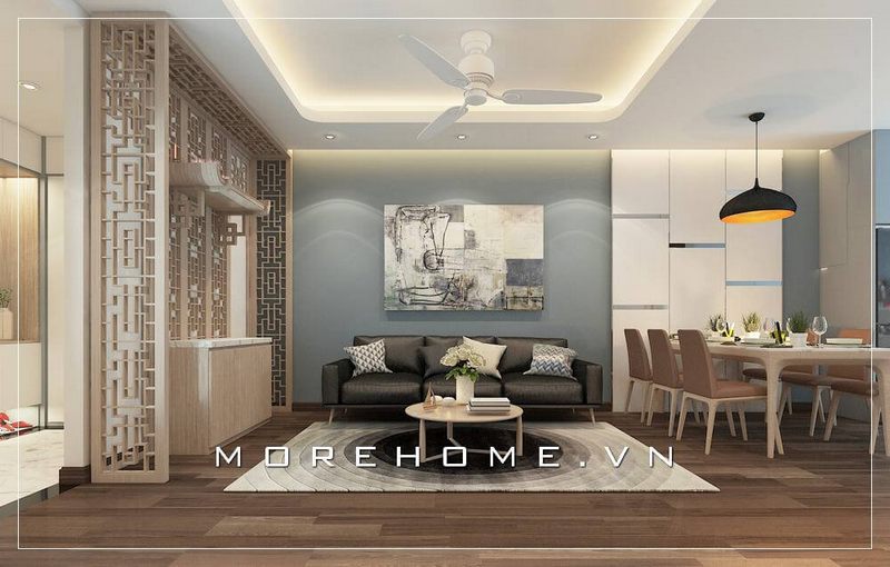 Ấn tượng với mẫu bàn thờ gỗ tự nhiên hiện đại được đặt trong phòng khách, biến căn phòng khách chung cư trở nên tâm linh vừa có tính trang trí thẩm mỹ cao.