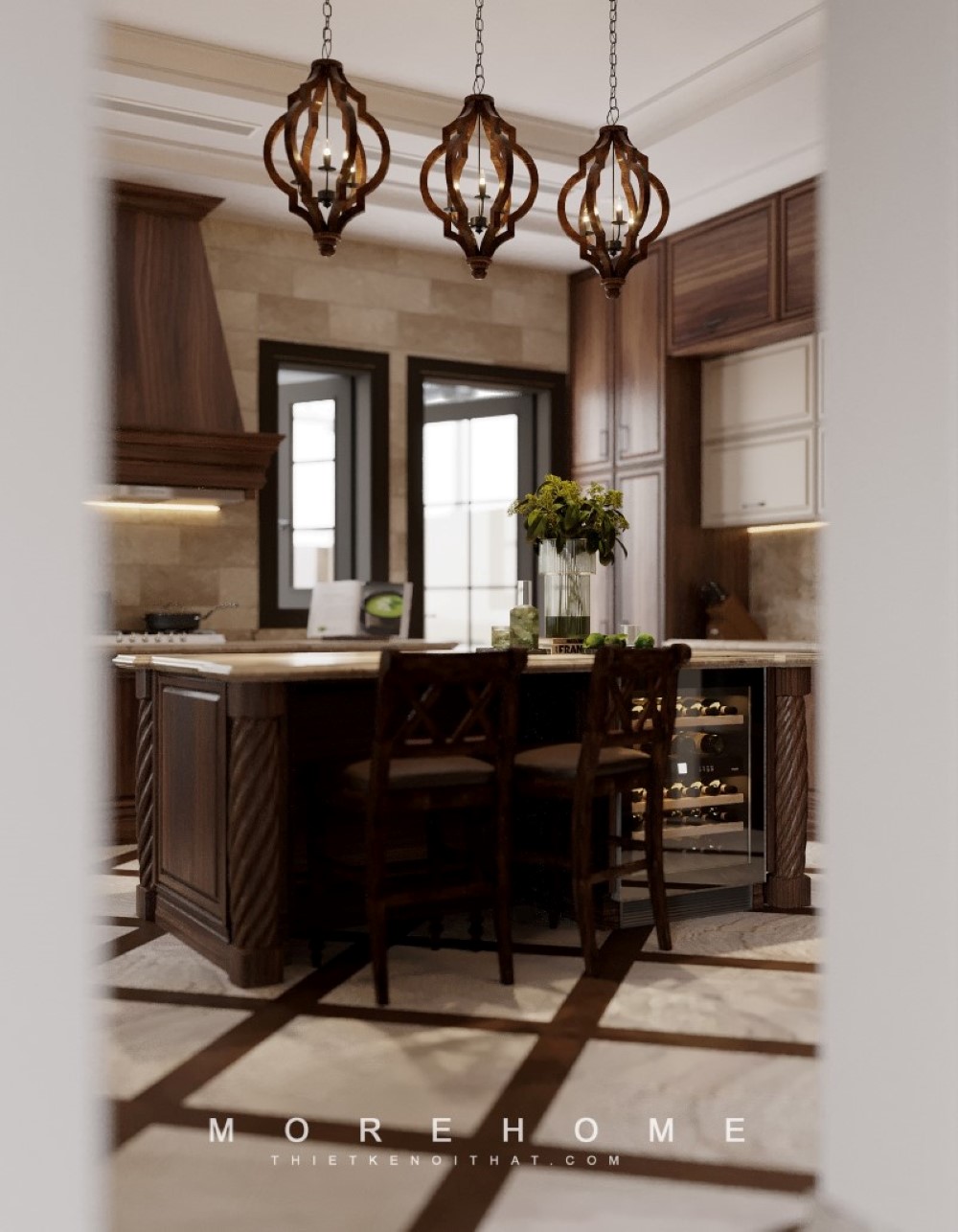 Đảo bếp gỗ óc chó mặt đá trắng địa trung hải tiện lợi cho sử dụng phù hợp theo ý thích.