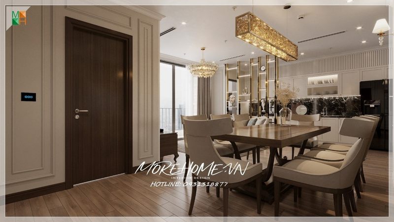 Đèn trang trí phòng ăn tô điểm trang trí mang điểm nhấn ấn tượng riêng không gian với ánh sáng vàng trầm ấm.