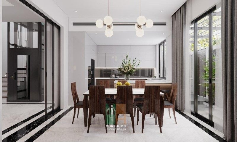 Phòng ăn liền bếp được nhiều gia đình lựa chọn bởi sự tiện nghi, thuận tiện cho sử dụng, kết nối không gian với nhau và mang tới thẩm mỹ cao