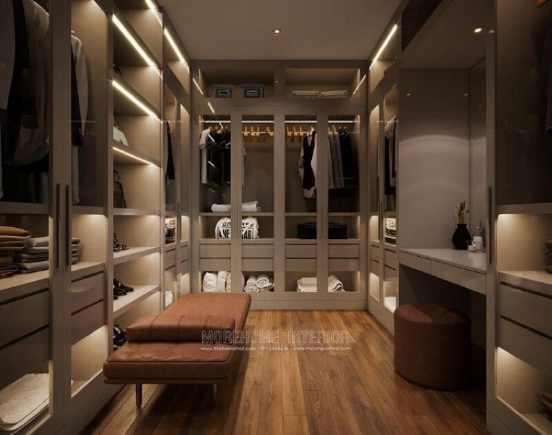 Không đơn thuần chỉ là một căn phòng để đồ đơn điệu của căn hộ chung cư, nhà phố, biệt thự mà nhà thiết kế rất sáng tạo khi thiết kế hai tủ đồ gỗ cánh kính hiện đại hai bên tường, vừa tận dụng được không gian mà còn thể hiện tính thẩm mỹ cao.